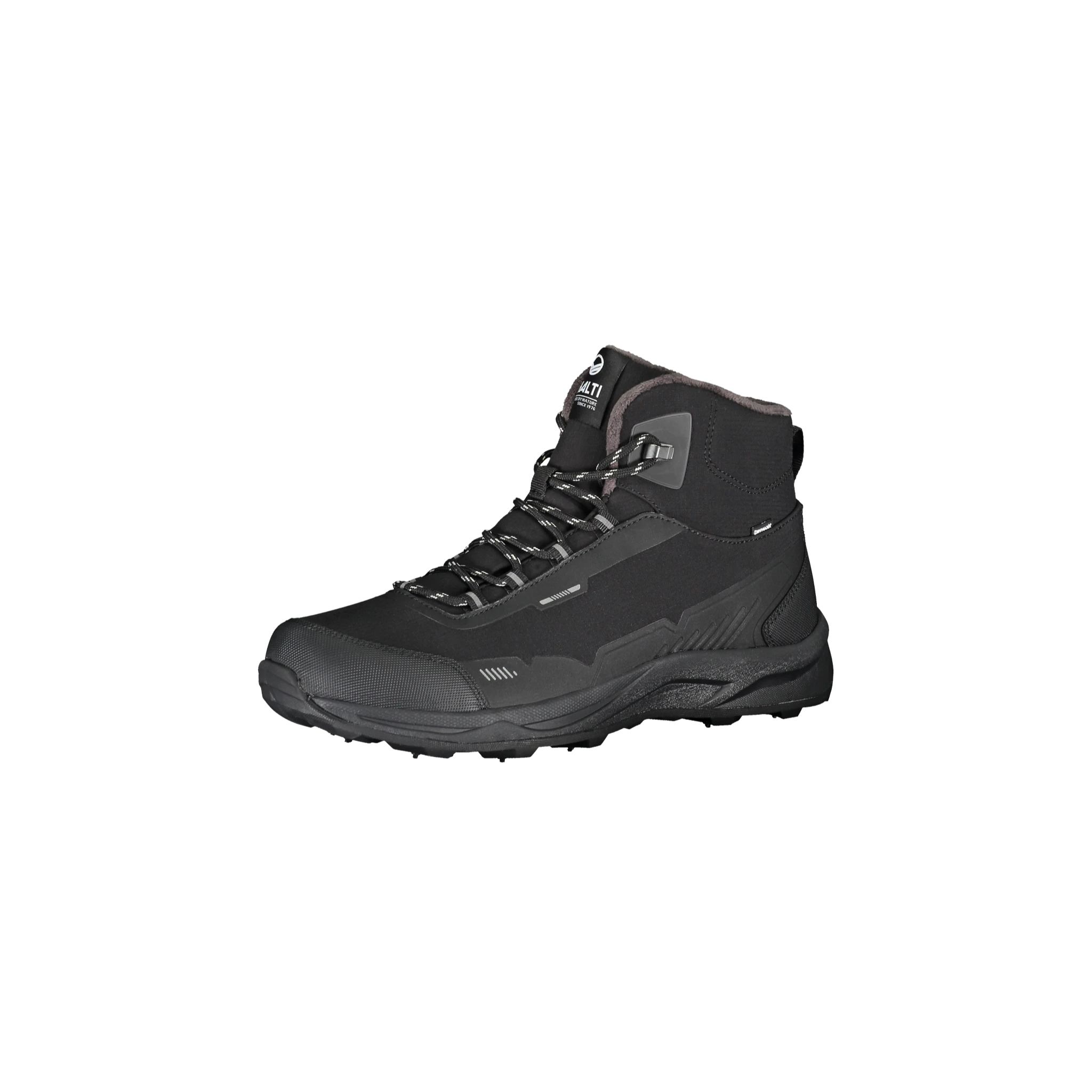 Halti Kenai Spike Boot is a waterproof and lightweight winter shoe designed for demanding terrain and outdoor activities. The upper is made from recycled softshell material, and the mid-cut design includes a DrymaxX® waterproof membrane with a warm textile lining to keep your feet dry and comfortable all day. The shock-absorbing Phylon midsole provides cushioning, while the rubber outsole with embedded carbon steel spikes ensures superior traction on ice and snow.