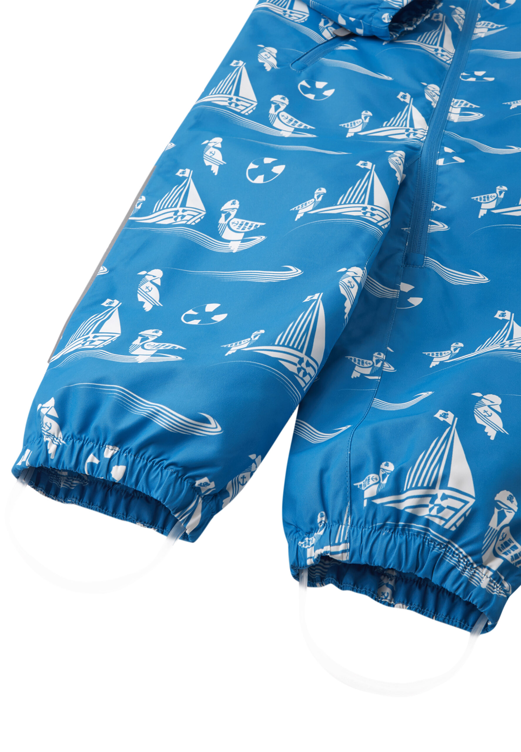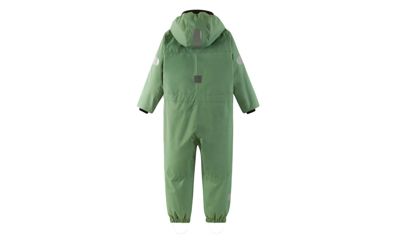 This spring overall for toddlers is made of waterproof material with all seams taped. The functional, windproof material is breathable and also dirt-repellent. The smooth polyester lining makes it easy to put on and does not get in the way during play. The hood is removable and child-safe, and the elastic foot loops, which are also removable, keep the legs in place. The overall is made of airy material and has many thoughtful details, such as an adjustable waist, a pocket with a zipper and reflective details. Our super comfortable overall for adventures in all weathers!