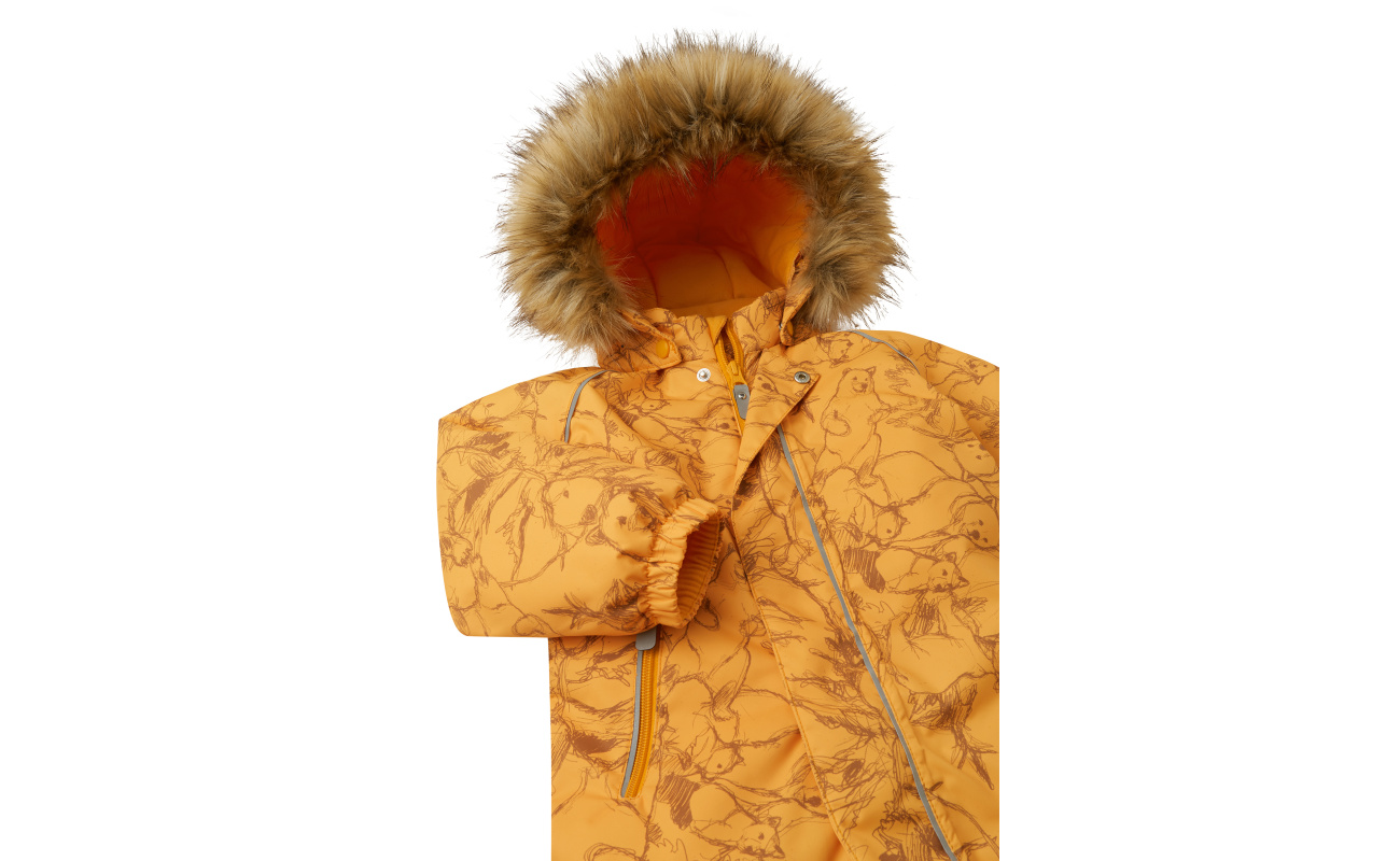This easy-care snowsuit for toddlers is ideal for winter fun. The waterproof design is made from a breathable and windproof material that repels dirt. All the seams have been waterproof sealed and the seat is insulated to keep bottoms warm and dry during cold-weather adventures. The smooth polyester lining makes dressing easy. Many Reima pieces can be attached to the suit thanks to the handy Play Layers snap-button system. The detachable and adjustable hood is also safe when little ones are playing outdoors – connected with snap buttons, it comes off easily if it gets caught on something. Durable silicone foot loops keep the trouser hems in place, protecting little ankles from moisture and the cold. This tumble-dryer-friendly winter all-in-one is a great choice for crawling in the countryside or strolling in the city!